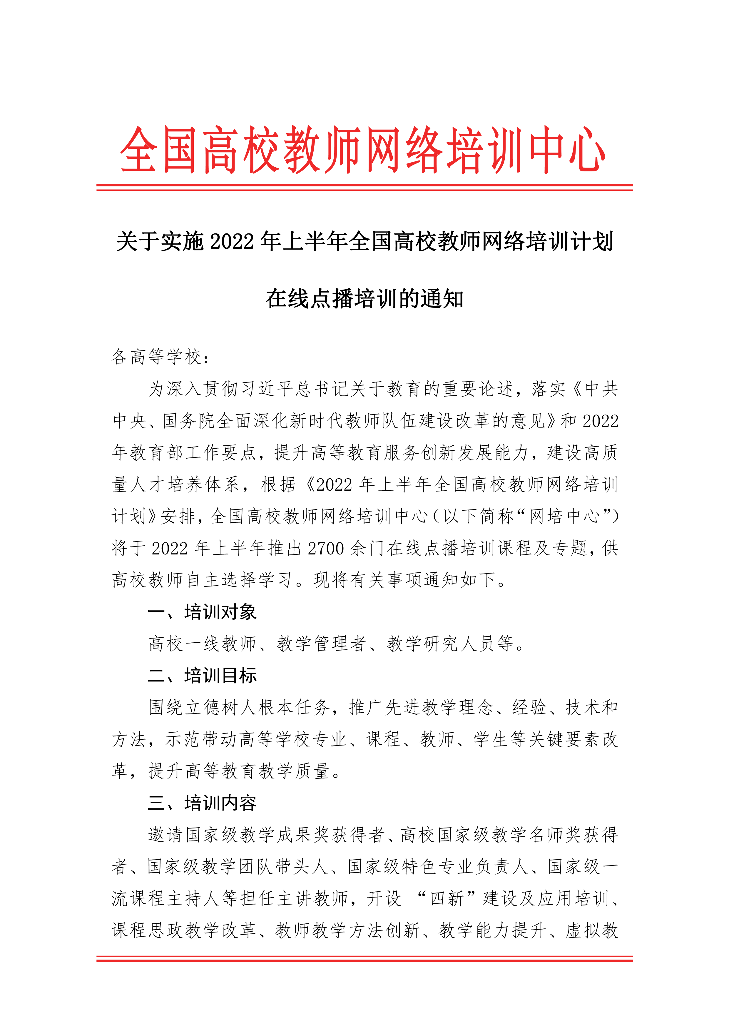 关于实施2022年上半年全国高校教师网络培训计划在线点播培训的通知